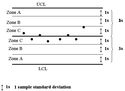 7 | 15INZC | Fifteen points in a row in zone C above or below CL |