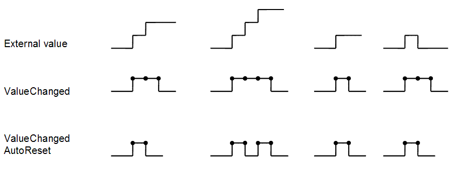 At the time of writing, ValueChanged and ValueChangedAutoReset are the only monitoring methods that are implemented. The pulse production for these methods is described in the figure below.
