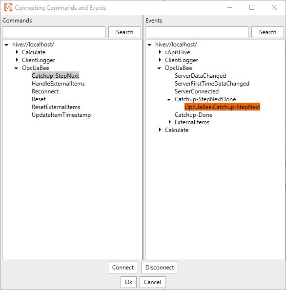 Each Apis module normally have set of events and a set of commands. An event in one module can cause a command to be fired in another module. The mapping of the events to commands are done in the Event Broker. The OPC UA client module has a specific event CatchUp-StepNextDone and a specific command CatchUp-StepNext, that fires when a catch-up step is done and triggers each step in the catch-up process respectively. The module also fires a ServerDataChanged event after a new set of item values are received, both during catch-up and normal operation. Only a single value for each item are updated for each trigging of the ServerDataChanged event.