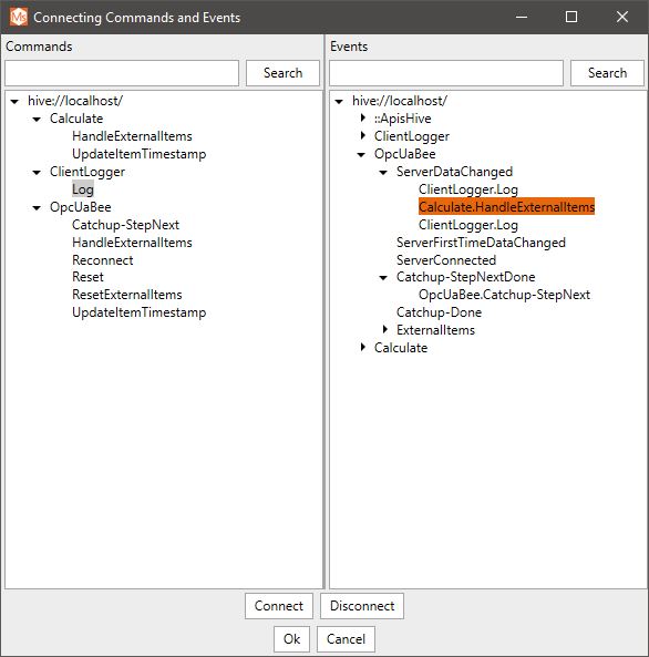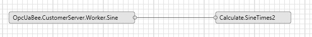 The OpcUaBee module has one subscription item that reads a sine signal from the a source systemed named CustomerServer. The Item is named CustomerServer.Worker.Sine. Further the Calculate module has one item, named SineTimes2, which has CustomerServer.Worker.Sine as input through the external item connection.