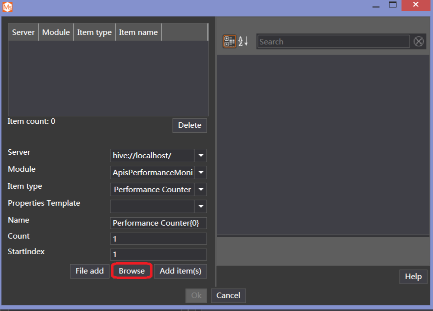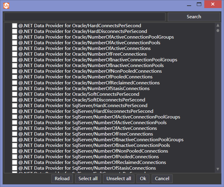 In this dialog, choose one or more Performance Counter and click Ok. You can also search for keywords in the Search bar on the top.
