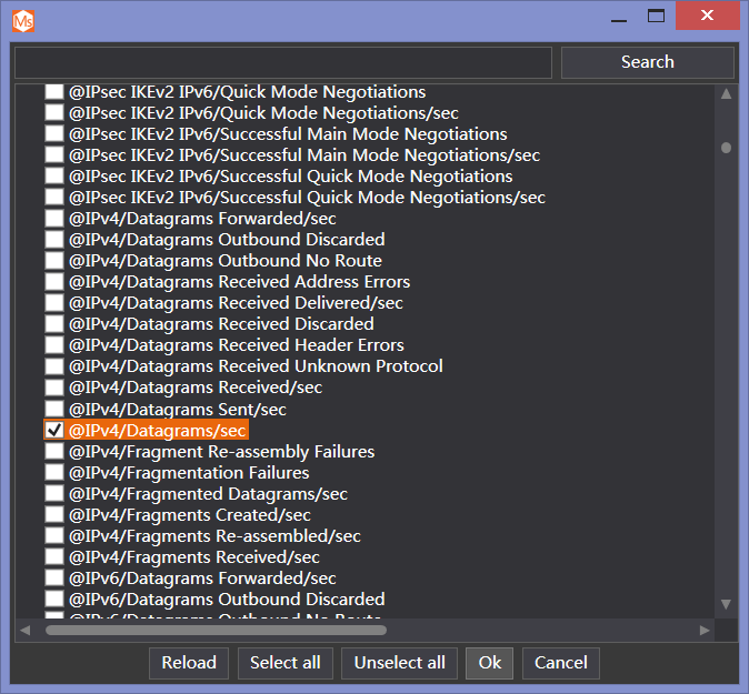 For example, if you want to monitor the incoming and outgoing internet connection speed, you can choose "@IPv4/Datagrams/sec":