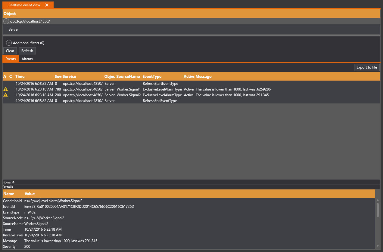 The real time event part is a tab view with two tabs, one is events and the other is alarms, the events tab shows all event, and the alarms tab shows the alarms.