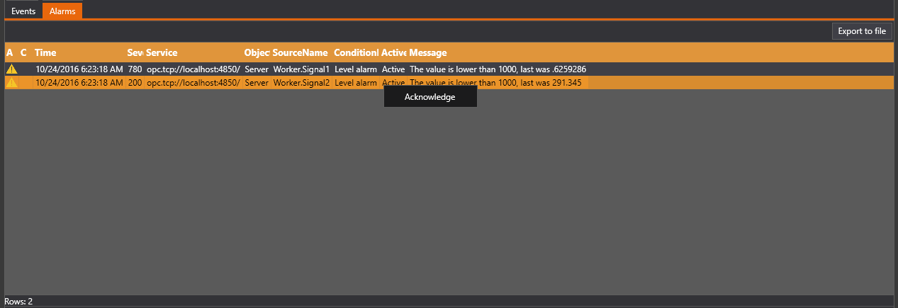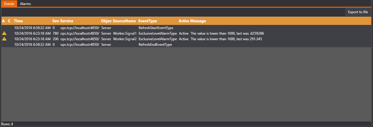 For both events tab and alarms tab, the user can click the 'Export to file button' to export the events to a text file.