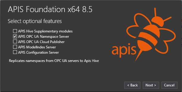 To install the Apis OPC UA Namespace Server, check the box for 'APIS OPC UA Namespace Server' when running the Apis Foundation install kit: