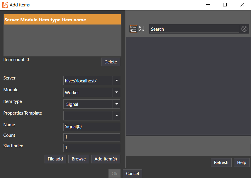 It's possible to add items from a tab-separated file. This is done by opening the "Add items" dialog. This dialog can be opened from the context menu of the Instance Node or the context menu of the Module Node.