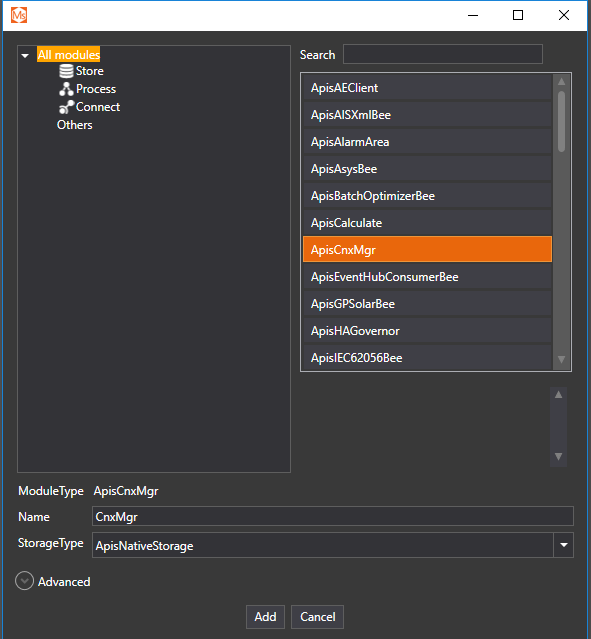 To create a module of this type, follow the guide Add Module to Apis Hive and select the module type "ApisCnxMgr":