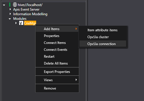 Next, items of type "OpcUa connection" must be added to the module. Right-click the new module in Solution explorer, select "Add items" and then "OpcUa connection":