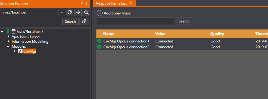 Repeat these steps for each OpcUa server that ApisHive should connect to. The item list in Apis Management Studio will show the status of each connection: