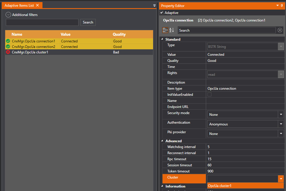 The connection manager module also supports the item type "OpcUa cluster", which is used when redundant OpcUa servers are available and you want ApisHive to automatically fail-over between these servers. After creating an OpcUa cluster item, select the connection items that are part of this cluster and assign their "Cluster" property: