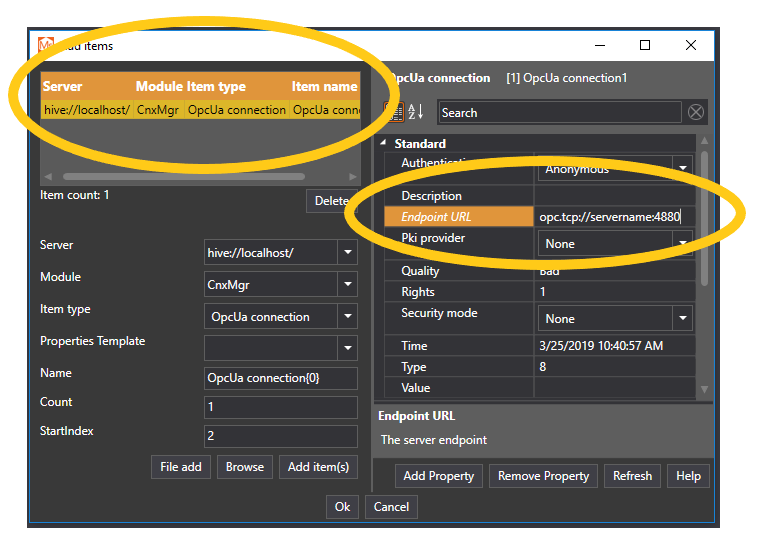 In the "Add items" dialog, click 'Add item(s)' to create an OpcUa connection item with the name "OpcUa connection1". Select this item in the item-list, and specify the "Endpoint URL" property for the OpcUa server: