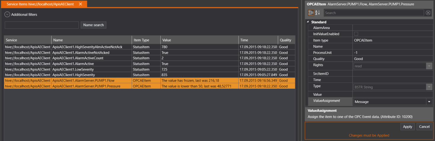 - The items will be automatically created when alarms & events are received. You can change the default alarm information to display on items of type OPC AE Item. Select the item and change the ValueAssigment