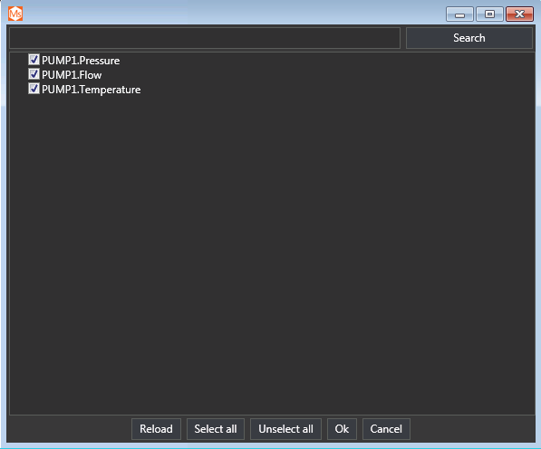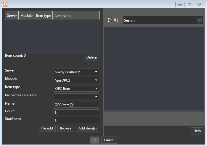 - A dialog opens that lets you select items from your OPC Server. Click "Ok" when done.