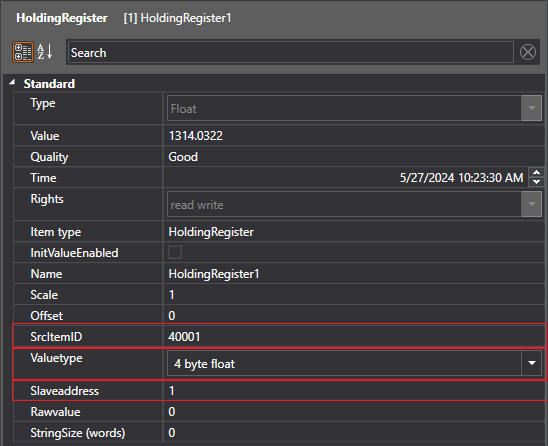 Assure SrcItemID of your created Holding register Item is pointing to valid register address like "40001", check the Slaveadress and set correct Valuetype of the value in the register of the slave. Attribute SrcItemID also represents the address of the item, for example, the item Holding register is of 2 bytes in size. This means, that there need to be proper increments of the SrcItemID value when it comes to SrcItemID based on the item type and the value it holds.