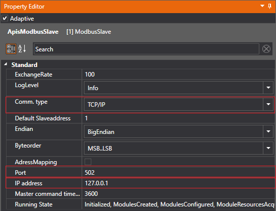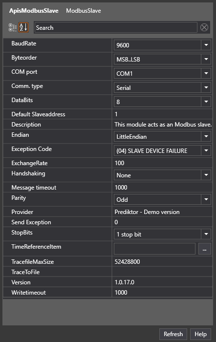 The module supports both serial (RTU) and TCP/IP (Modbus TCP) interface, depending on your needs. In the Properties Editor, enter values for:
