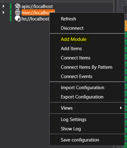 Open Apis Management Studio and right-click on the "hive" instance in Solution Explorer, then select "Add Module" from the menu.