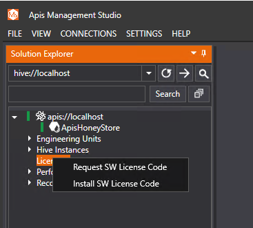 - Expand "apis://localhost" -> "Licensing" -> -> "Install SW License Code". A dialog box opens, where you can browse to select, then open the license file. This completes the license key installation.