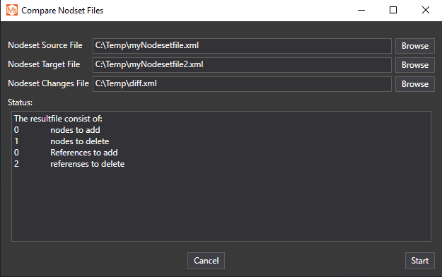 The Source and target can either be a Nodset file or a Nodsetchanges file. The result will always be a Nodesetchanges file and consist of the nodes/references one have to add/delete to the source namespace to get the Target namespace. If a node exist in both namespaces, but have different attribute content, it will be a node in the result file in the section nodestoadd. In the Status area of the form, the number of nodes/references that have been added/deleted are displayed