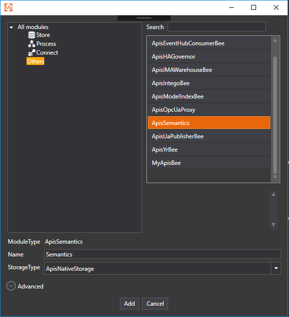 In the Add a Module dialog, ApisSemantics is located in the Others group. Give the module a name and press Add.