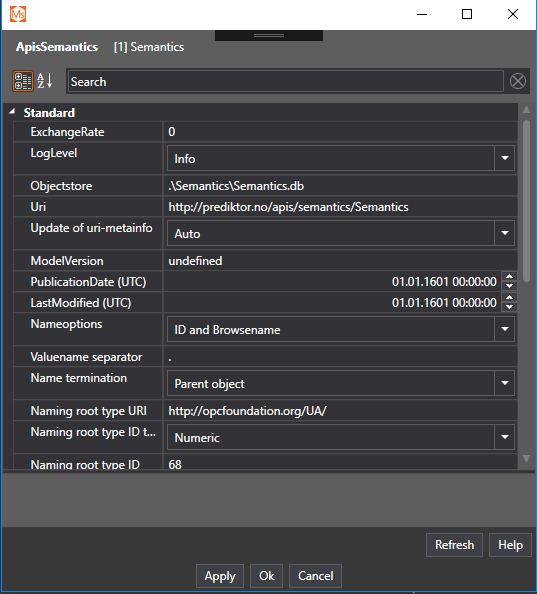 A new dialog appears, giving you the opportunity to manipulate properties for the module. Setting the Uri is the most important step at this point. For a description of all properties, see ApisSemantics properties.