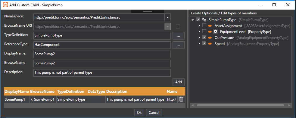 Children of any type of object or variable can be added in this dialog. If a child is not a part of the parents type, the child will not have a modelling rule.