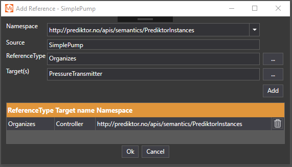 Enter data for your new reference in the dialog. Press the Add button when done. You can add multiple references in this dialog. The new references are listed in the table below the Add button. New references are not created before you press the Ok button.