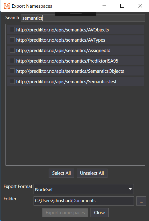 Click the Export namespaces button to export.
